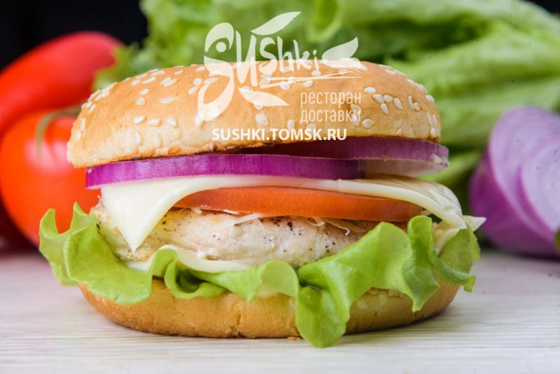 Состав: Булочка для гамбургера, мясная котлета, лист салата, сыр Чеддер, помидор, маринованный огурец, лук красный, соус.