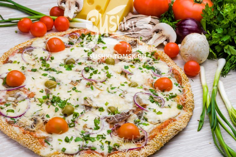 Состав: Соус Бьянко, ассорти из грибов , помидоры, корнишоны, сыр "Моцарелла".