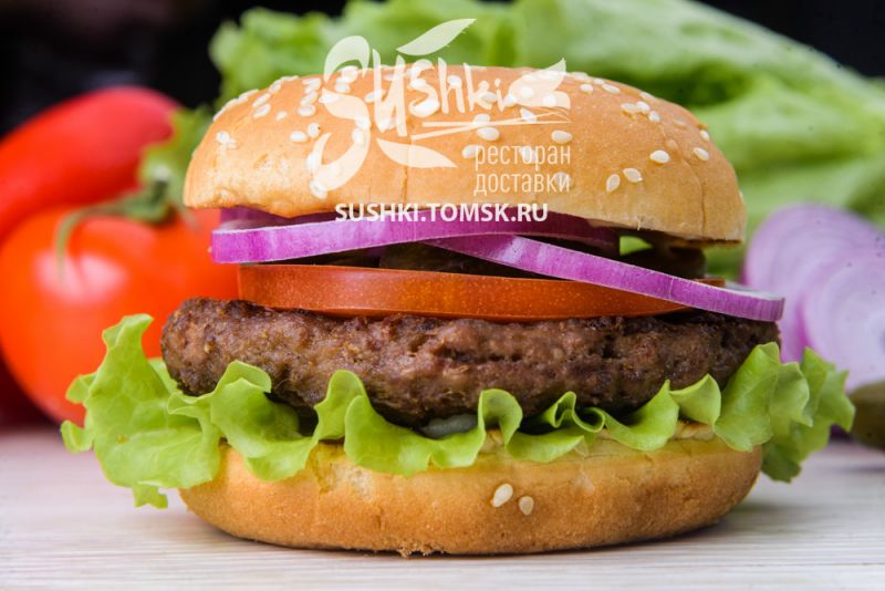 Состав: Булочка для гамбургера, мясная котлета, лист салата, сыр Чеддер, помидор, маринованный огурец, лук красный, соус.