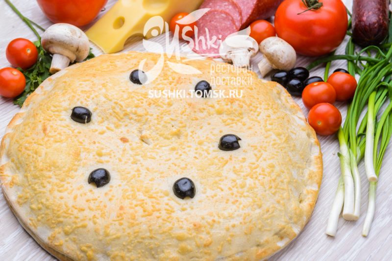 Состав: Соус "Томатный", куриная грудка, перец болгарский, помидоры, маслины, сыр "Моцарелла".