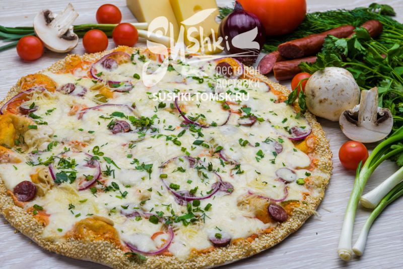 Состав: Соус "Томатный", бекон, шампиньоны, маслины, красный лук, корнишоны, сыр "Моцарелла".