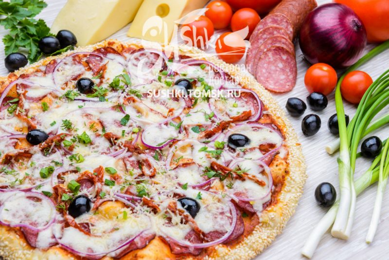 Состав: Соус "Томатный", ветчина, курица, бекон, маслины, сыр "Моцарелла".