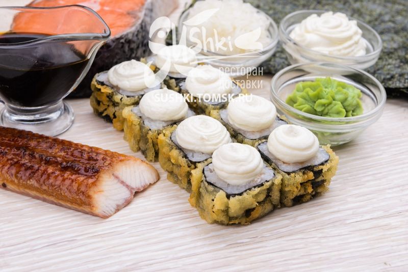 Состав: Рис, лосось, сыр творожный, соус "Лава"