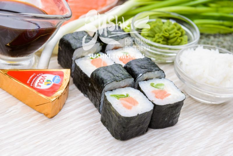 Состав: Рис, сыр "Viola", икра лососевая, лук зеленый, лосось.