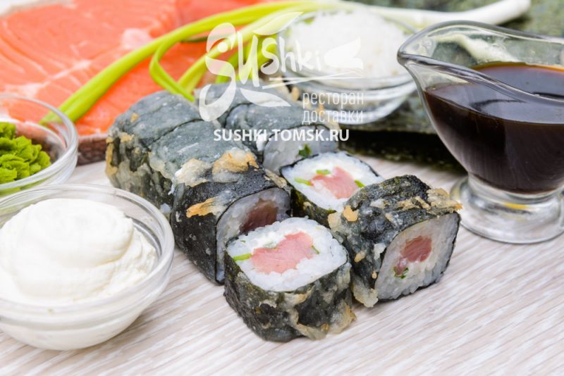 Состав: Рис, лосось, икра "Тобико", сыр творожный, соус "Лава".