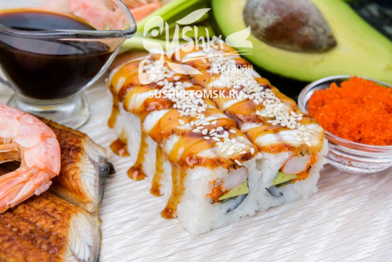 Состав: Рис, лосось, икра "Тобико", сыр творожный, соус "Лава".