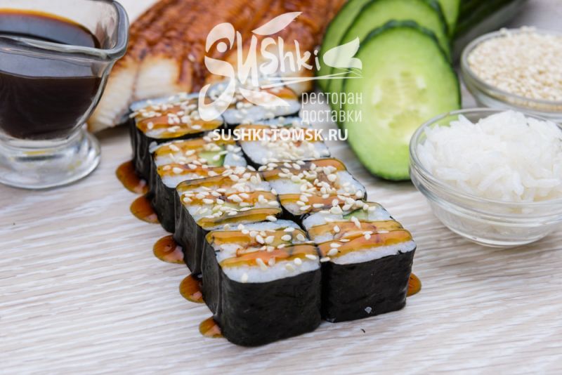 Состав: Рис, угорь, сыр , помидор, лосось.