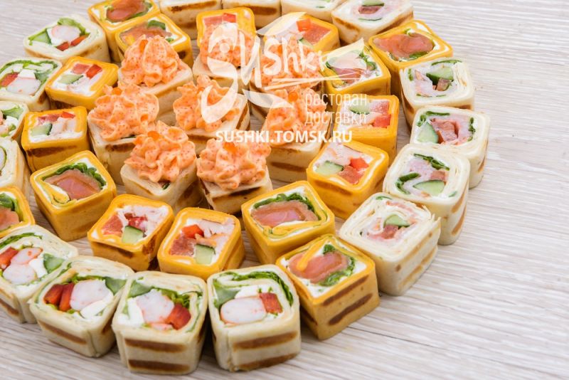 Состав: ролл "Унаги Маки", ролл "Гейша", ролл "Сяке Маки" ,ролл "Каппа Маки", ролл "Шиитаки Маки", ролл "Канагава", ролл "Сяке Тамаго Маки", ролл "Тамаго Маки".