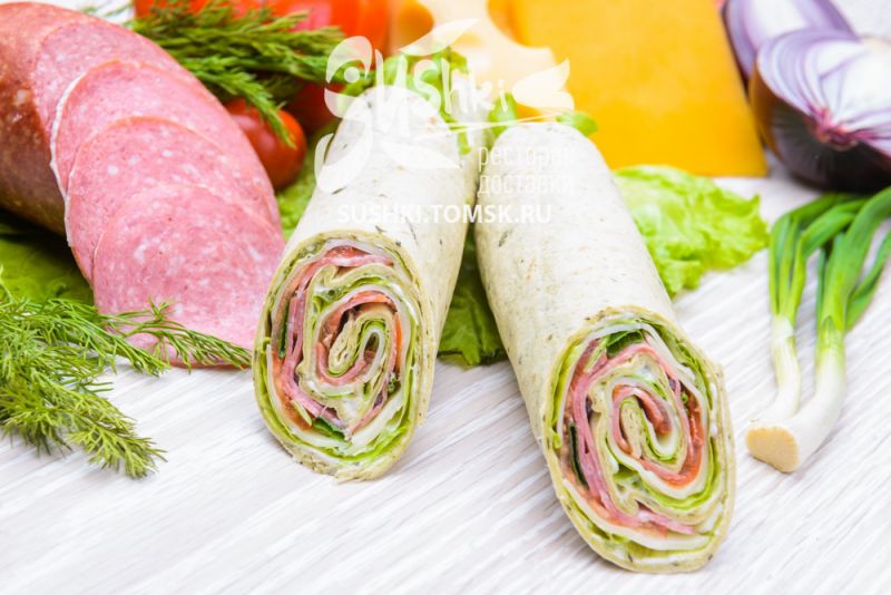 Состав: Тортилья, соус "Бьянко", куриная грудка, сыр "Моцарелла", лист салата, помидор.