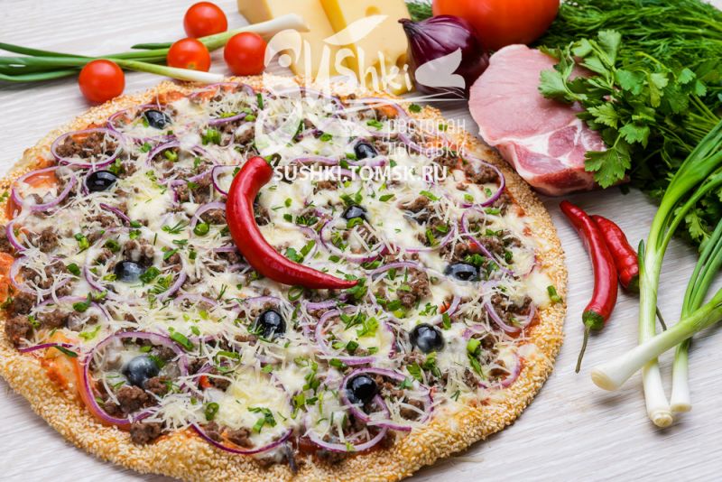 Пицца с беконом, в сочетании с шампиньонам и корнишонами, красным луком и маслинами, сыром "Моцарелла" и соусом "Томатный".